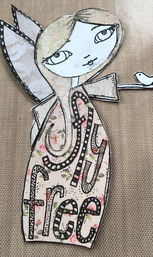 I be used Trish’s stamp from the Worldgirl series – 5 on several pieces of KasiserCraft paper from Mademoiselle. Cut the relevant pieces out from each page and fitted them to my stamped imaged.