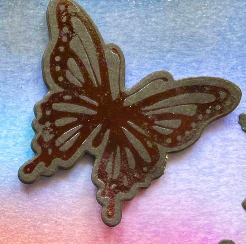 Now to finish off, you know I love my glimmer plate from spellbinders and couldn’t resist using it on my page. First I glimmered and die cut my butterfly using black foil on black card stock