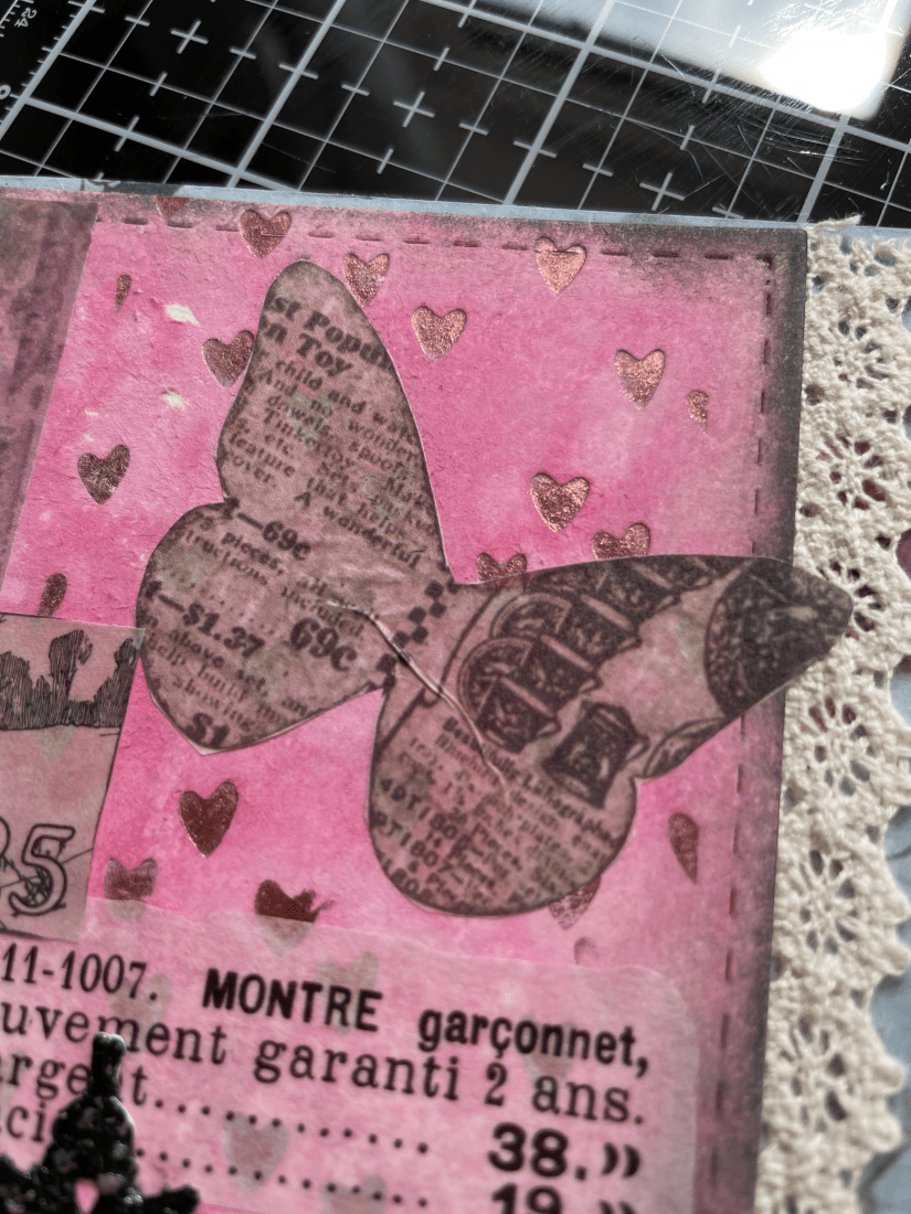 So this simple looking card started with a slimline stitched die being used on Distress mixed media card by Ranger. I then added the glimmered hearts using Spellbinders hot glimmer system. I applied both distress oxide and ink in Kitch Flamingo to the cut card, then edged the card with Walnut stain distress ink to age it slightly.