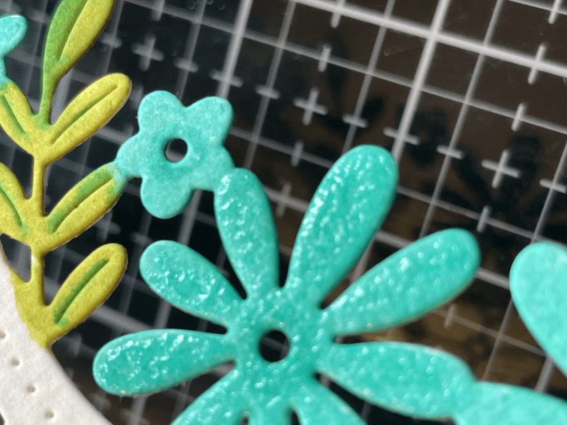 Next using my hot glimmer system I added more flowers and a sentiment. again I coloured the flowers with the same inks. I added some green from Rustic Wilderness.