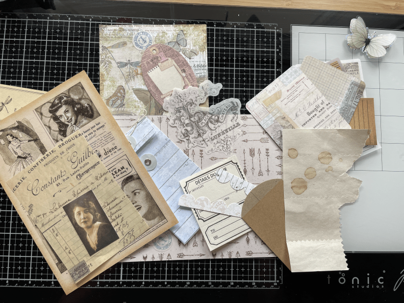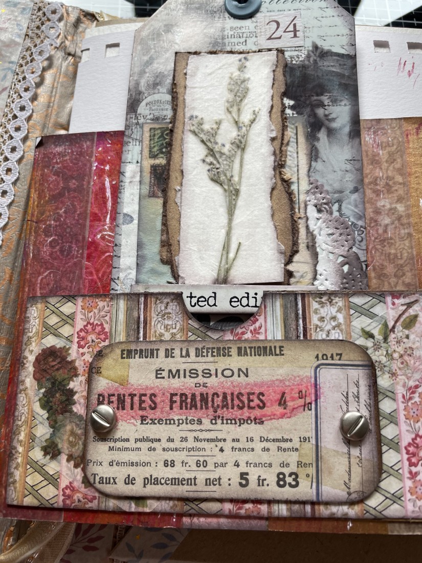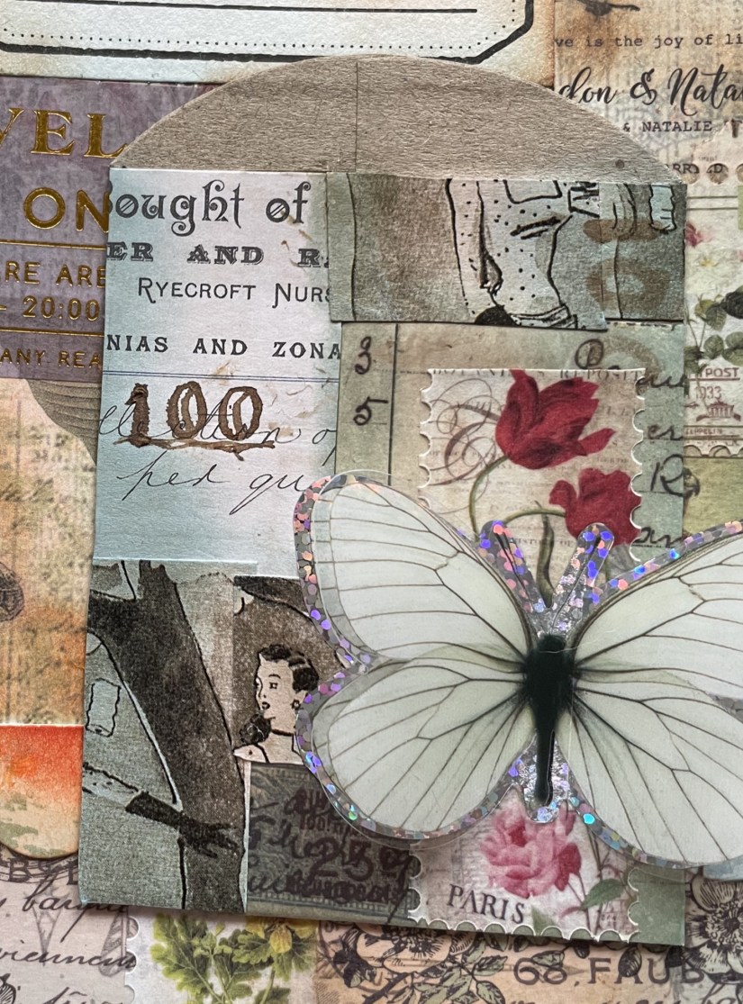 I decided I wanted to use a pocket to house a tag so set about creating the tag using the same method of cutting and sticking chosen pieces which have been inked. I chose a large butterfly to bring the page and pocket together.