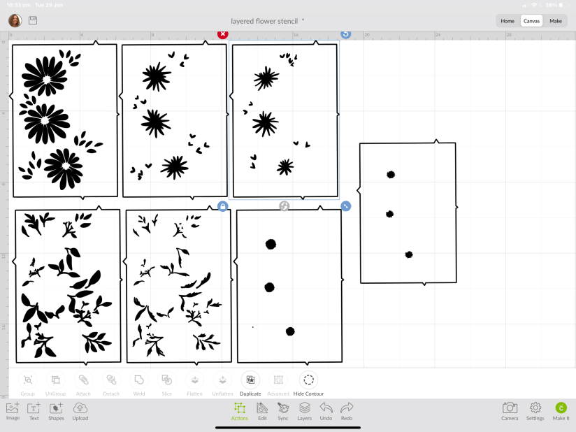 So. I started in Procreate with the initial sketch and then built up the layers with different colours (2nd image) once i was happy with the layout (i actually flipped the image which is why it looks different in the finished image) I changed each layer to black and saved each layer individually. These were then inputted into design space (Cricut’ s app) to get them ready to cut. in the image above of the different layers you can see originally I created 7 layers, to save on Mylar I edited it down to 6, I did this by combining some elements which didn’t clash, such as the venter detail the green shading