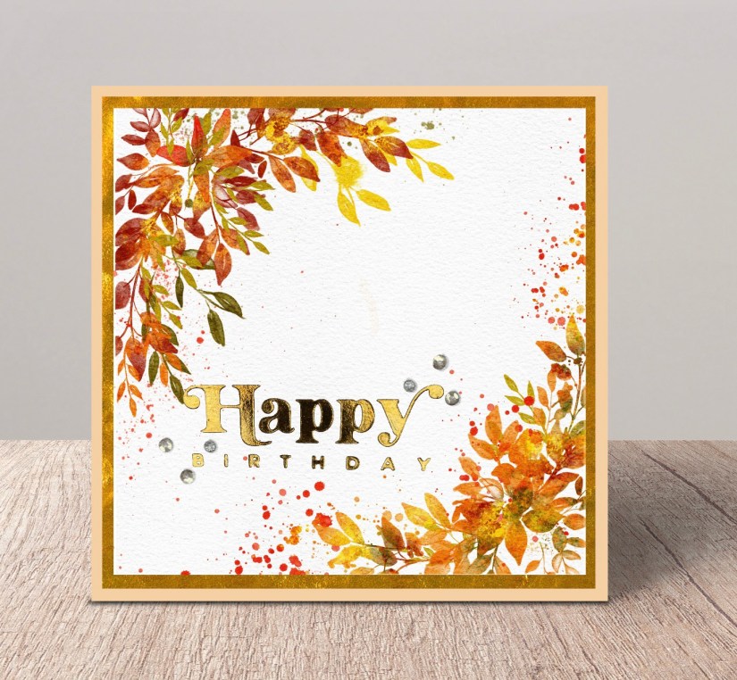 Unfortunately I forgot to take process shots, as I got carried away. Today I used Derwent inktense paints which come in a pan form and mixed myself various oranges and yellow with a little subdue green. However, distress inks would work really well for this project and had I been able to get at them is what I would of used. They are packed away with most of my other supplies so I grabbed what I could for this card. I used my Princeton brushes in several sizes and experimented with different leaves.