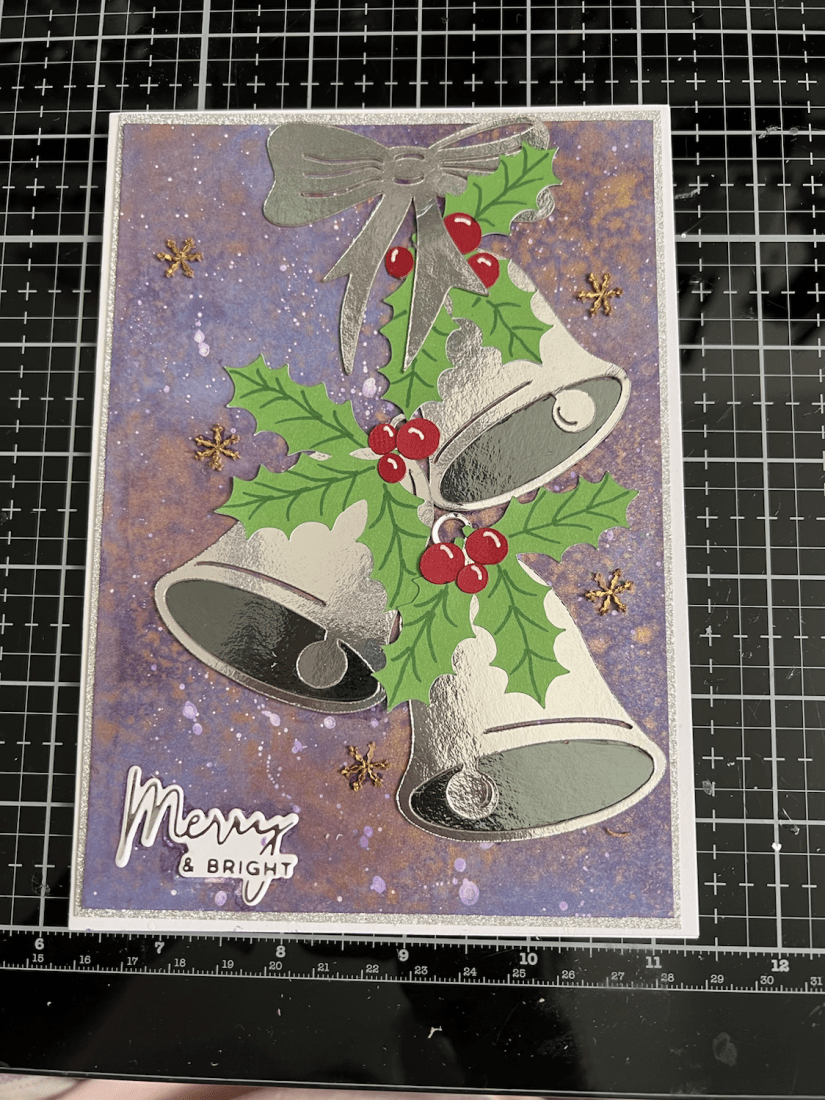 I payed out my bells and holly and stuck it all down. For the sentiment I chose one of Spellbinders Christmas glimmer plates which has a matching die. To finish I added some detail to the leaves and white highlights to the berries. I also added some tiny snowflakes which were the negative waste from another project which were some gift tags with a snowflake cut out. (always keep your negative shapes from die cuts as you can always find a use for them)