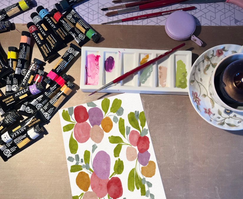 So I set the seen, lit my candle, put on some relaxing music and gathered my supplies. At this point I didn’t know what I was going to do and felt i’d just let the art flow. So I started just laying some blobs of colour down. I mixed up a few colours that I wanted to use and stuck to those colours.