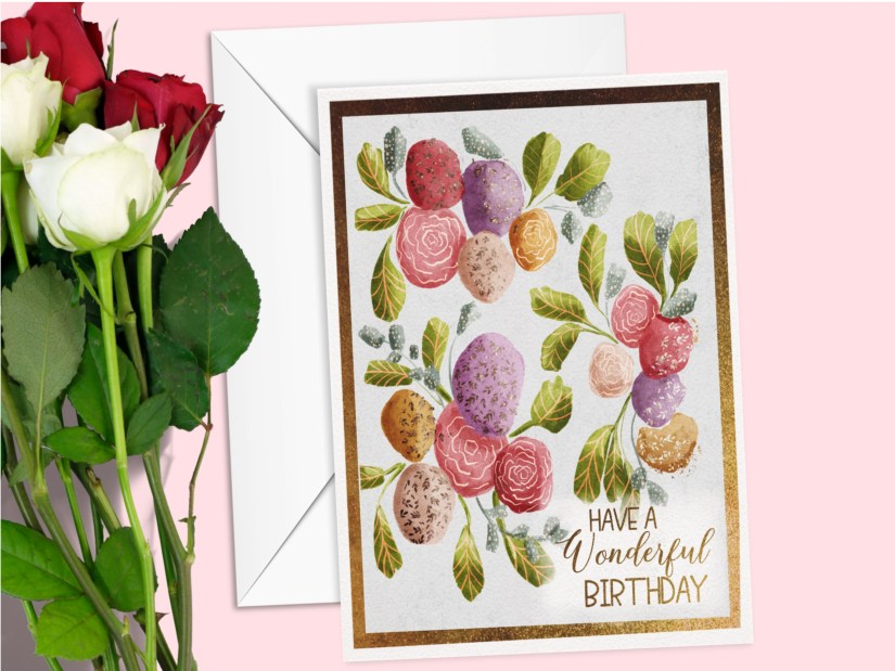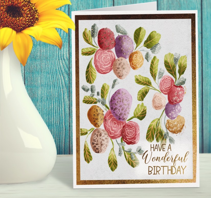 I then sized this to fit an A5 card printed this off onto printable watercolour paper. I mounted it onto a gold Matt layer and then onto the card. Using metallic vinyl and my Cricut Joy I made a sentiment to add to the card to finish.
