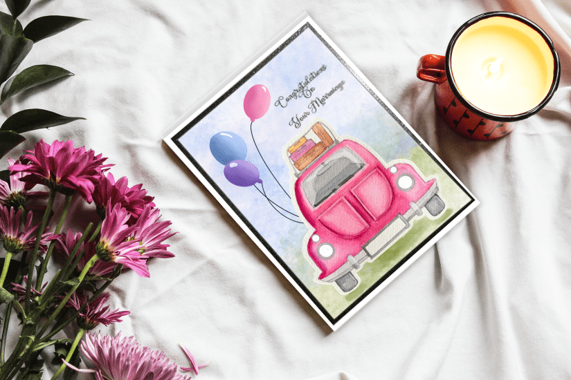 I then added the car, I added a little shading with pencil here and there to finish it off. At this point I noticed I had forgot to add headlights so using Gauche I added them. I also Thought some balloons would look good so added them too. To finish I wrote and cut out a sentiment on my Cricut Joy using adhesive vinyl and secured this in place.
