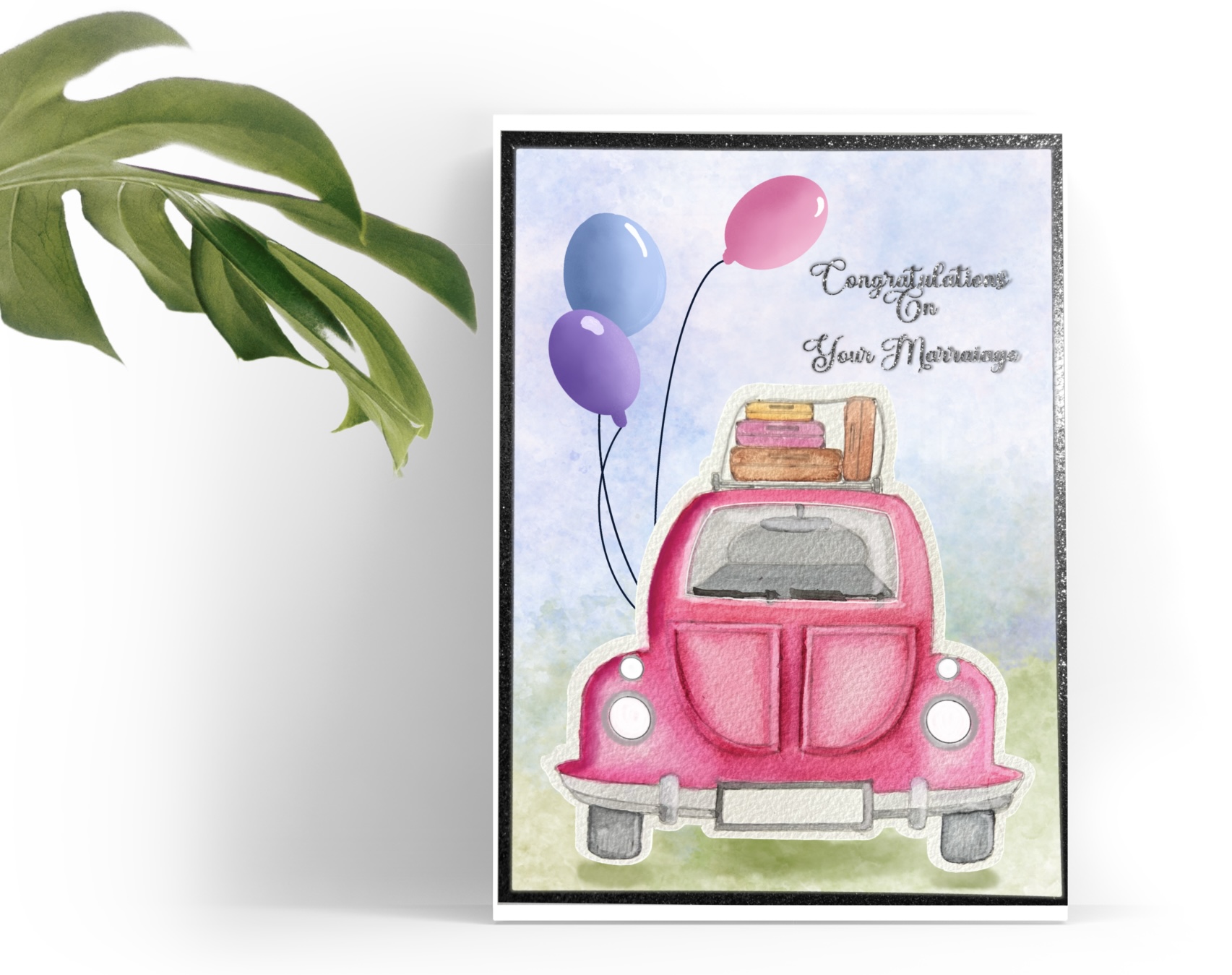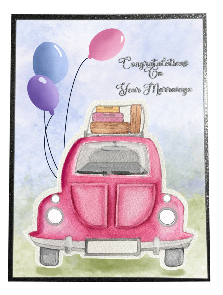 I then added the car, I added a little shading with pencil here and there to finish it off. At this point I noticed I had forgot to add headlights so using Gauche I added them. I also Thought some balloons would look good so added them too. To finish I wrote and cut out a sentiment on my Cricut Joy using adhesive vinyl and secured this in place.