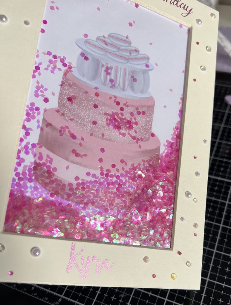 Lastly I cut the sentiment and her name using my Cricut Joy and smart glitter vinyl and added some gems to complicate the rest of the card. for once this looks much better in the flesh than the photos can do credit.