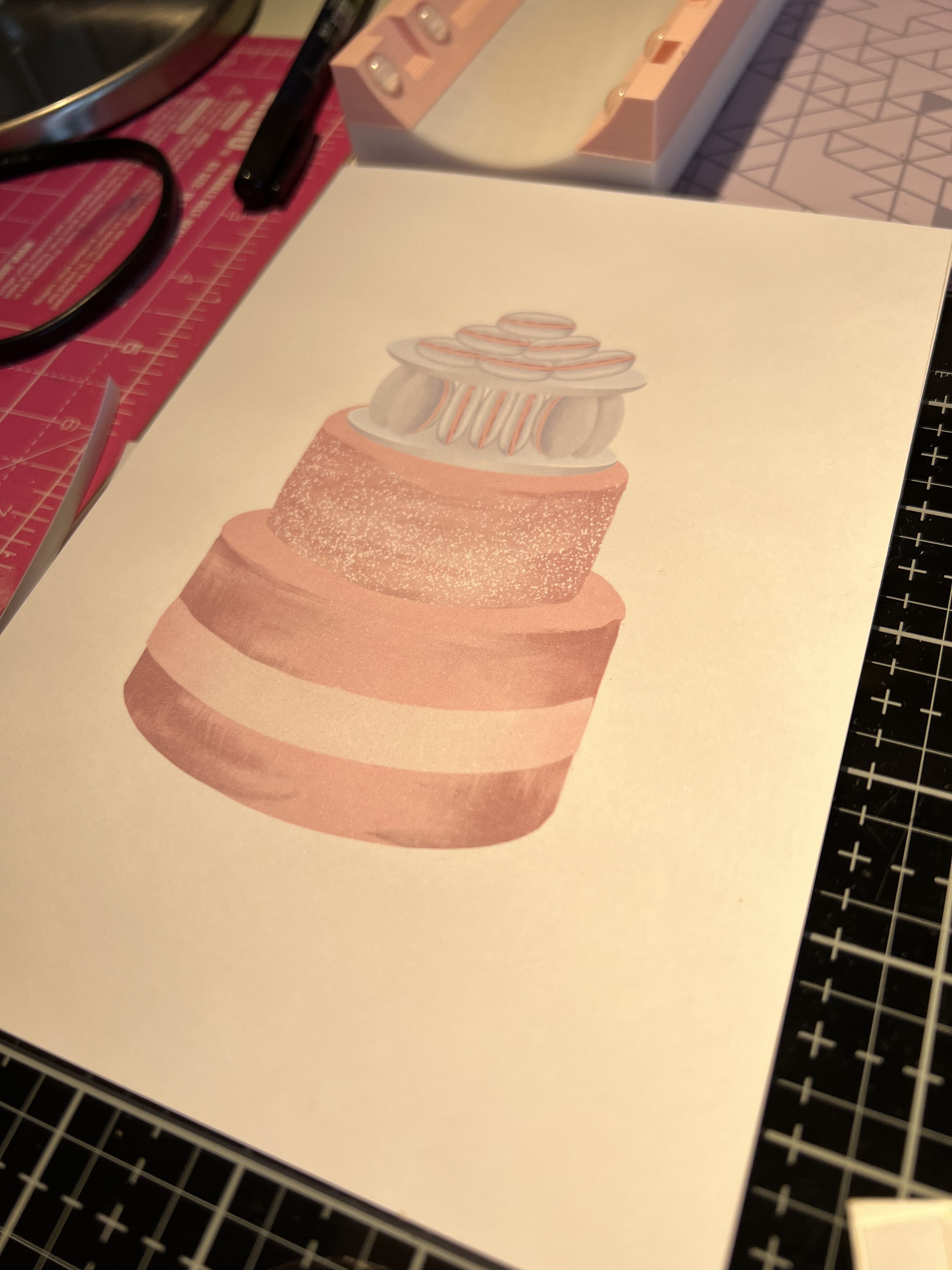So I started with a cake design I created a few months ago for a different project. I made a few alterations and then printed it out on to medium weight card stock and cut it to size. I used a watercolour card blank I purchased from the SAA an online artists community. They are fabulous as you get everything you need, the card, the mount, envelope and watercolour paper on which to paint. It enables you to send an a5 image ready mounted as a card which can be used in frame as well. So the cake!