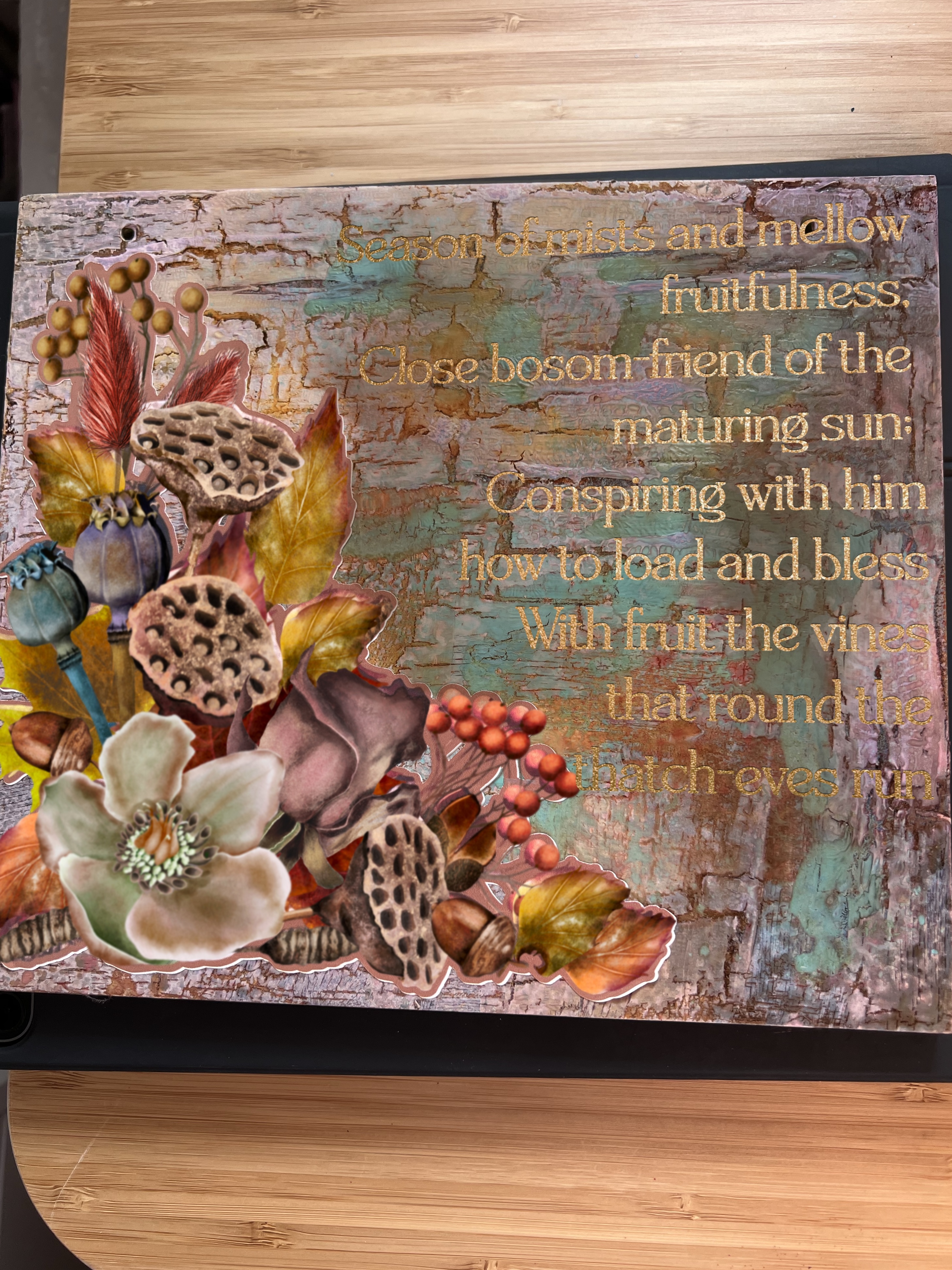 Once I was Happy with the composition I saved It as a png file then sent it to Cricut Design Space. I then Set it up to print and cut. I set an offset around it so that it left a small gap, I printed It on to printable vinyl. Once printed I fed It back into my Maker 3 to cut out the design.I also created what I wanted written to the maker to cut out. This was a real pig getting it sorted. Firstly, weeding the words was a real pain as several letters either moved or stuck themselves to the waste vinyl. Once I sorted that out, I used the wrong transfer sheet, I used a medium contact instead of a strong one which made transferring the words really difficult. I chose The the first few lines from to Autumn from Keats