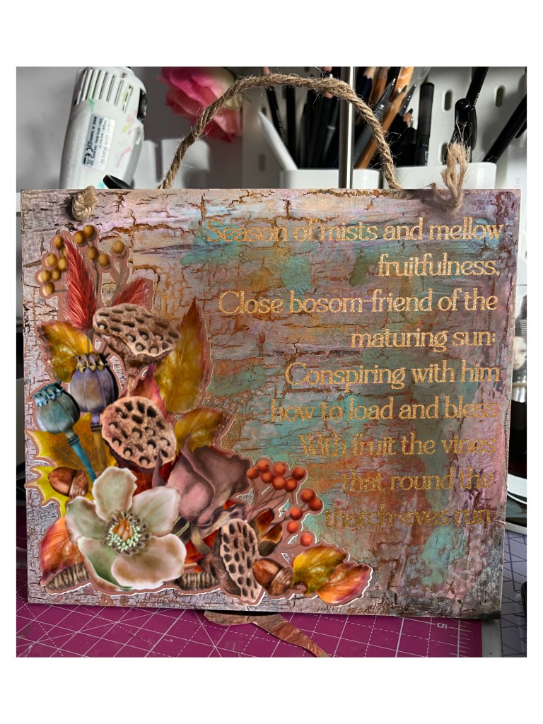 Once completely dry I used several oxide sprays in autumn colours and then dried itwith a heat tool.Once it was completely dry I brought it all together. At first the background was really dark enough but I added Some dark ink the give a bit more depth and help the words pop a little more.