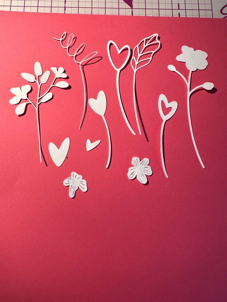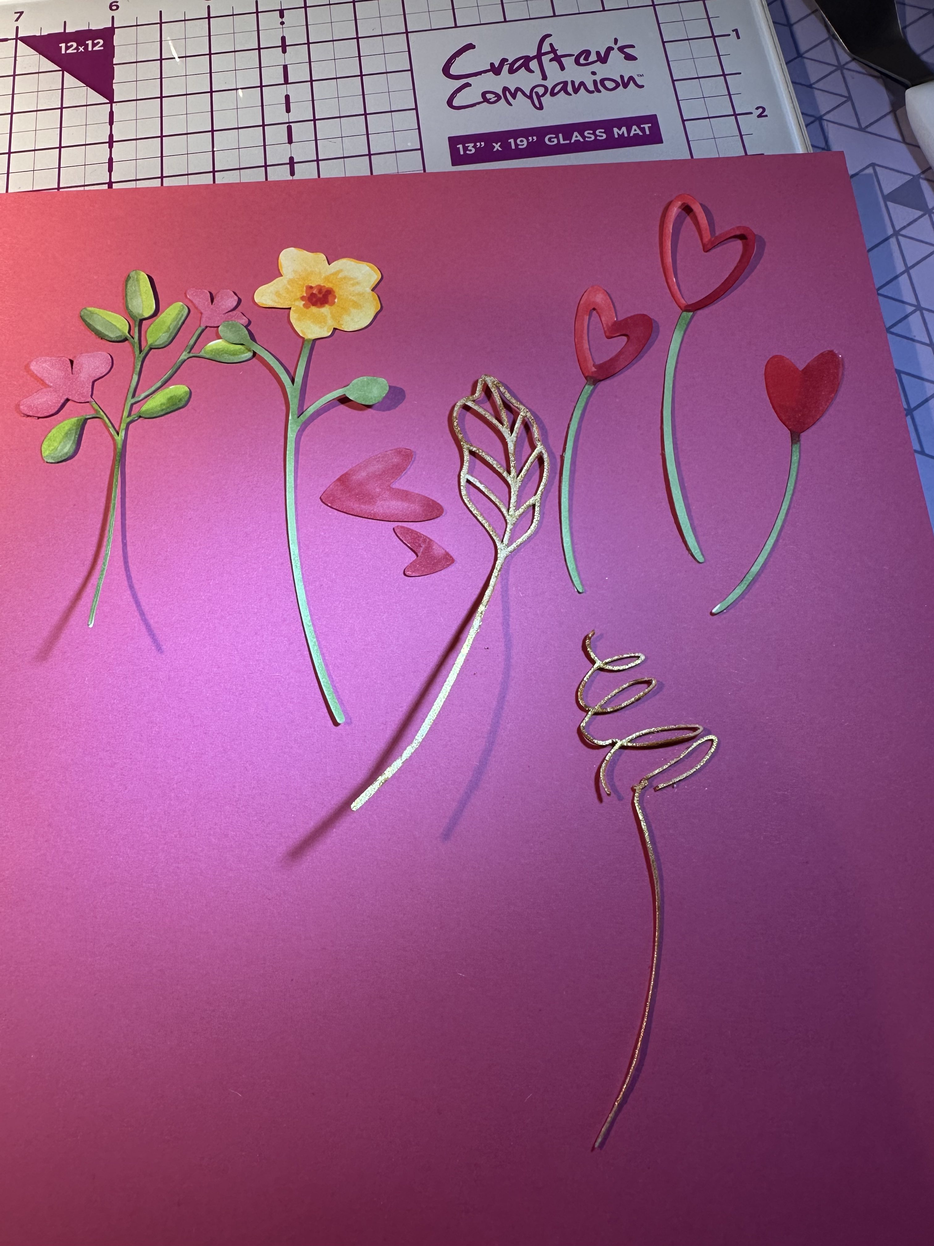 I made up my card using the pink card above and then a gold mat on which I placed a watercolour background I had painted with hearts and x and os. They are very feint as I wanted the die cuts to be the focal point.