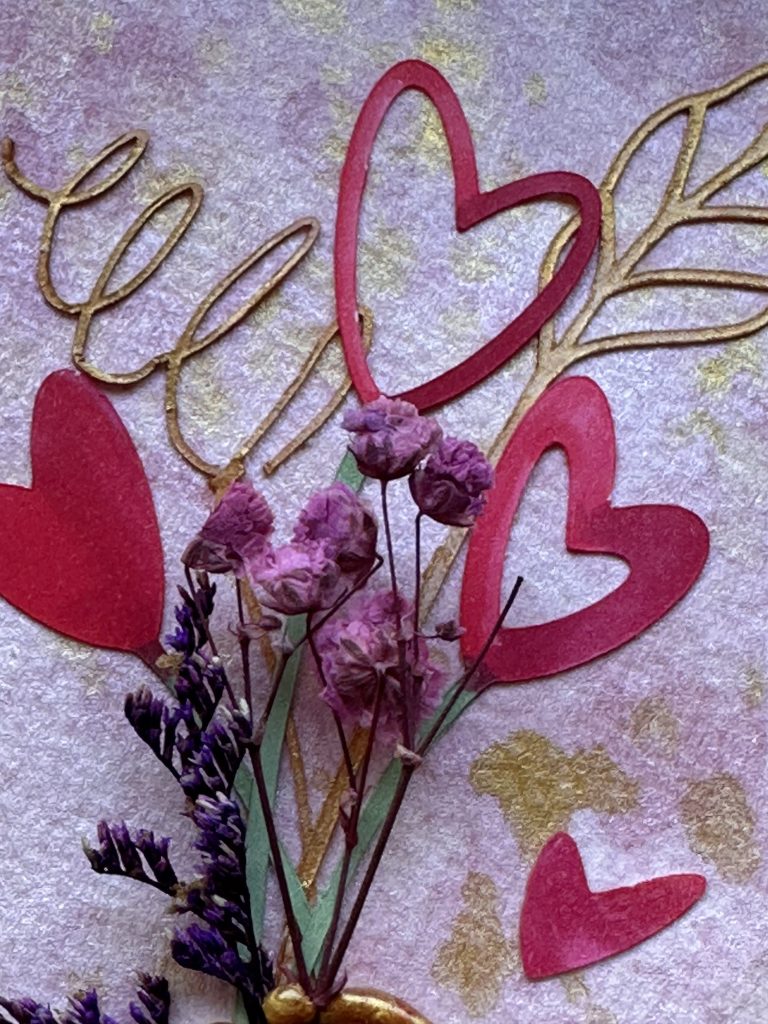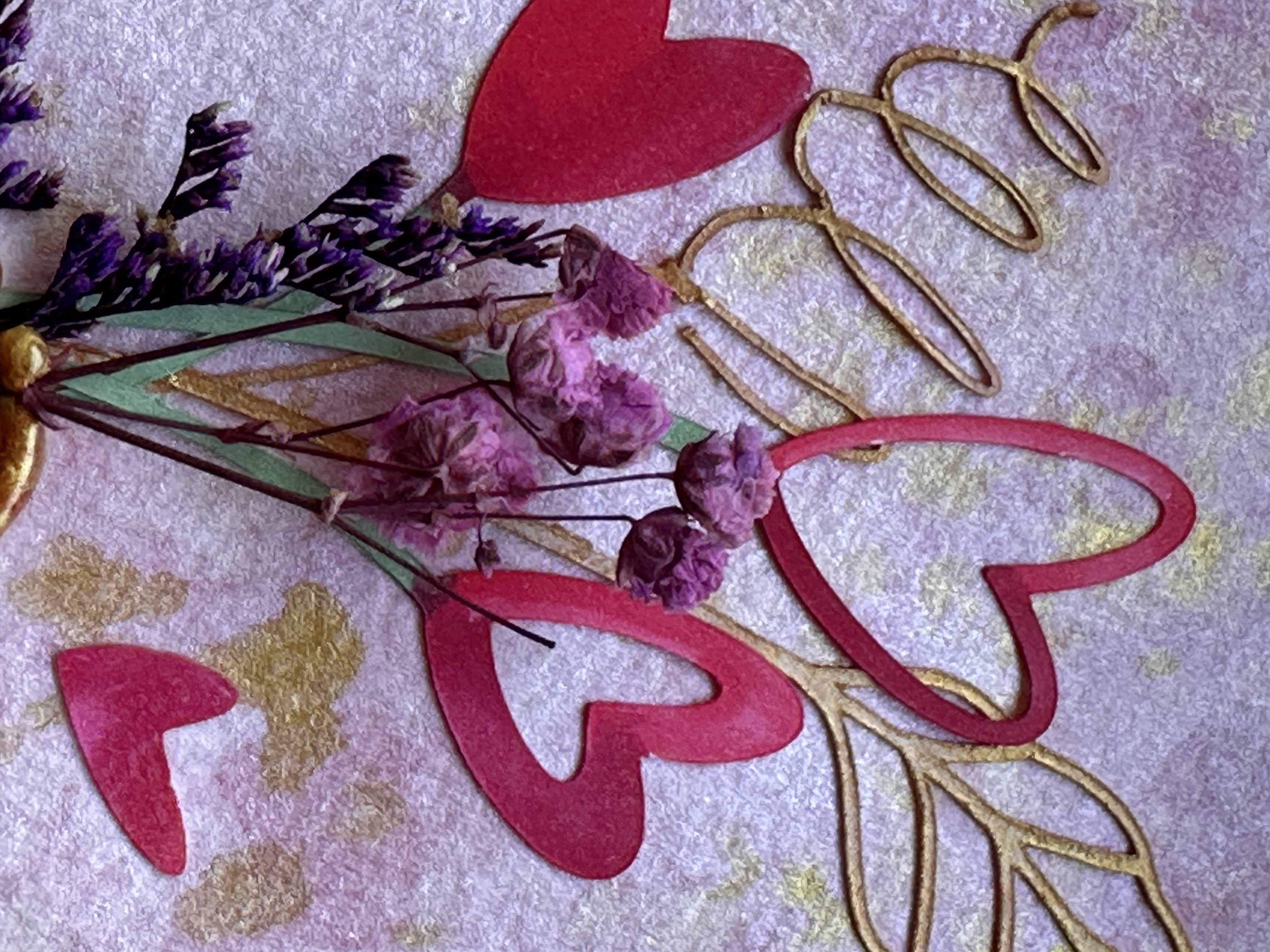 So I arranged My dried flowers onto the dies cuts, added my melted wax and placed my stamp on top, I left It there for a few seconds then removed it. To finish my card I used hot foil to add my sentiment (I think this one is from spellbinders).