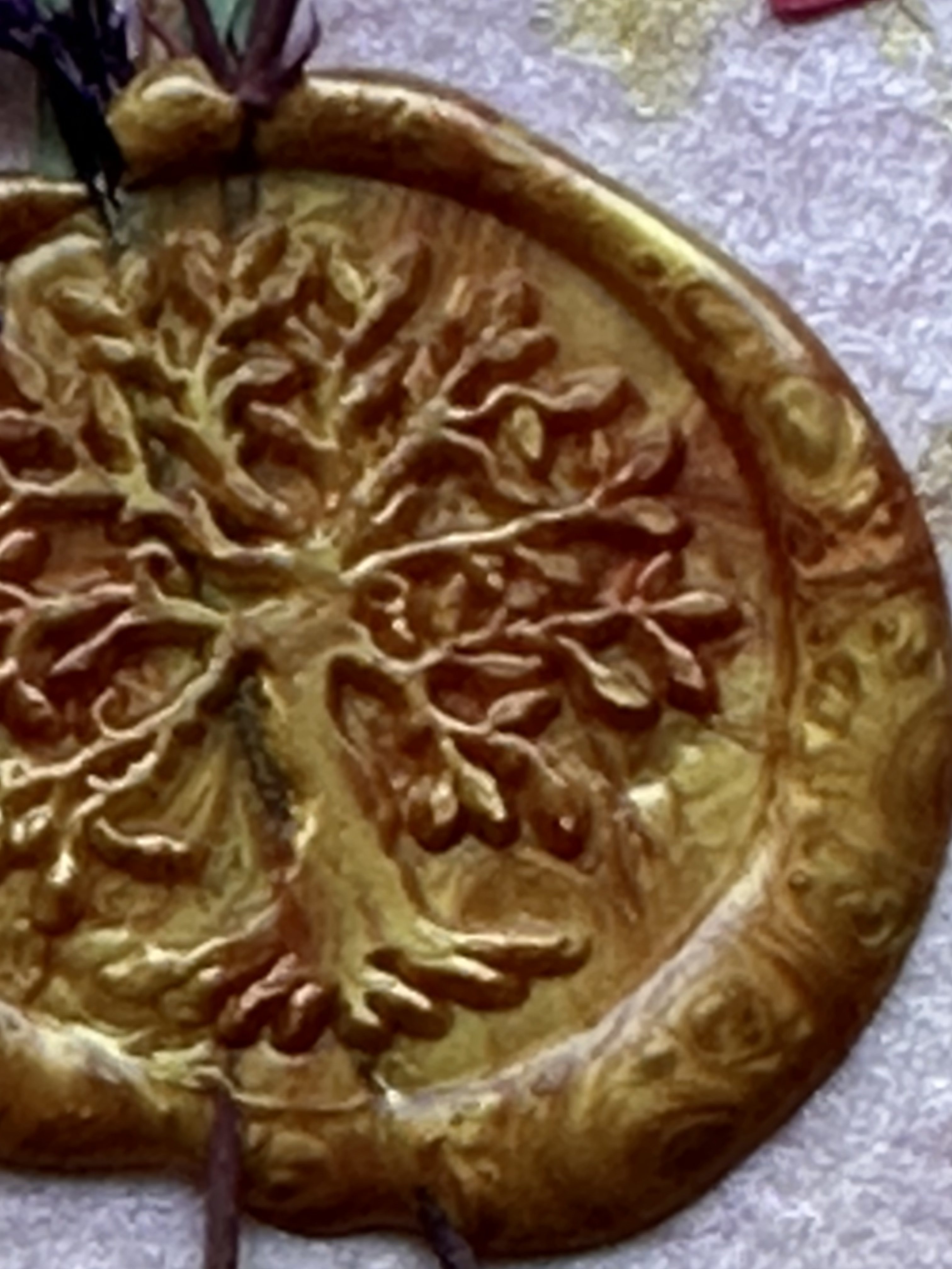 I purchased a small kit which contained a variety of wax beads, the spoon holder, spoon and some candles. I had a few wax stamps which I purchased years ago but do intend to purchase more. There are two main ways to add your seal, straight onto your project as I have or you can pour your wax onto a silicon mat stamp it then store your seals to use on your projects.