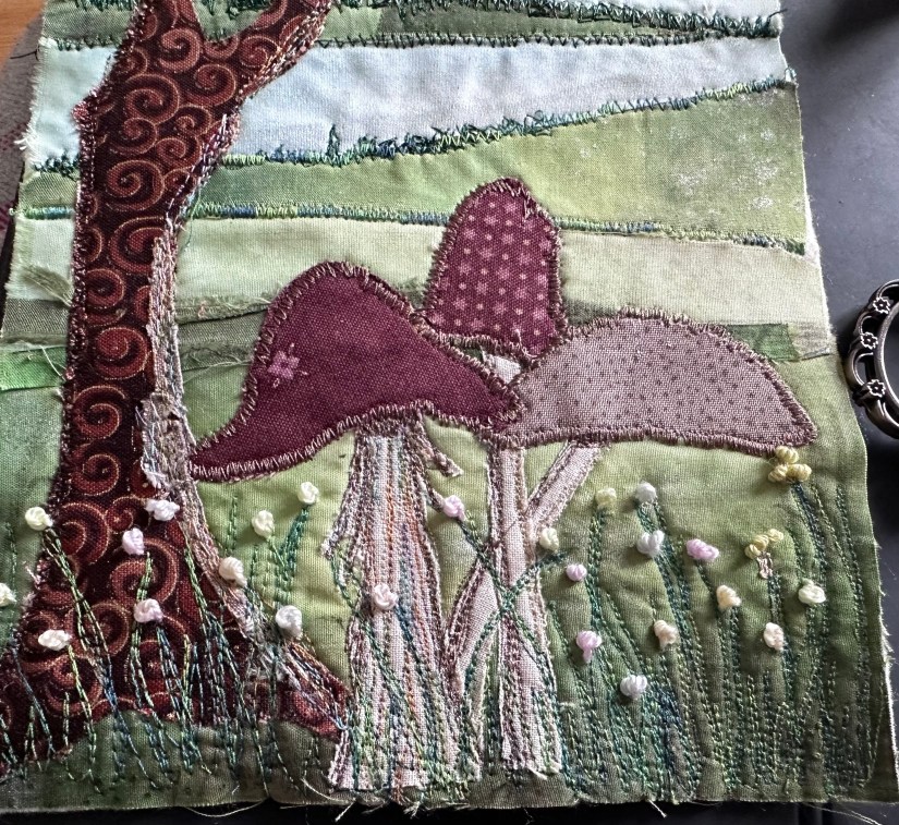 Next I worked out what was going to be on my foreground I knew it had to contain fungi and something with wings so decided on what and then went through my fabric stash which to be honest isn’t huge at all so I was quite limited. However, I decided on which fabrics I wanted to use and stuck them to the heat and bond. I drew the images I wanted and then cut them out and ironed them in place.