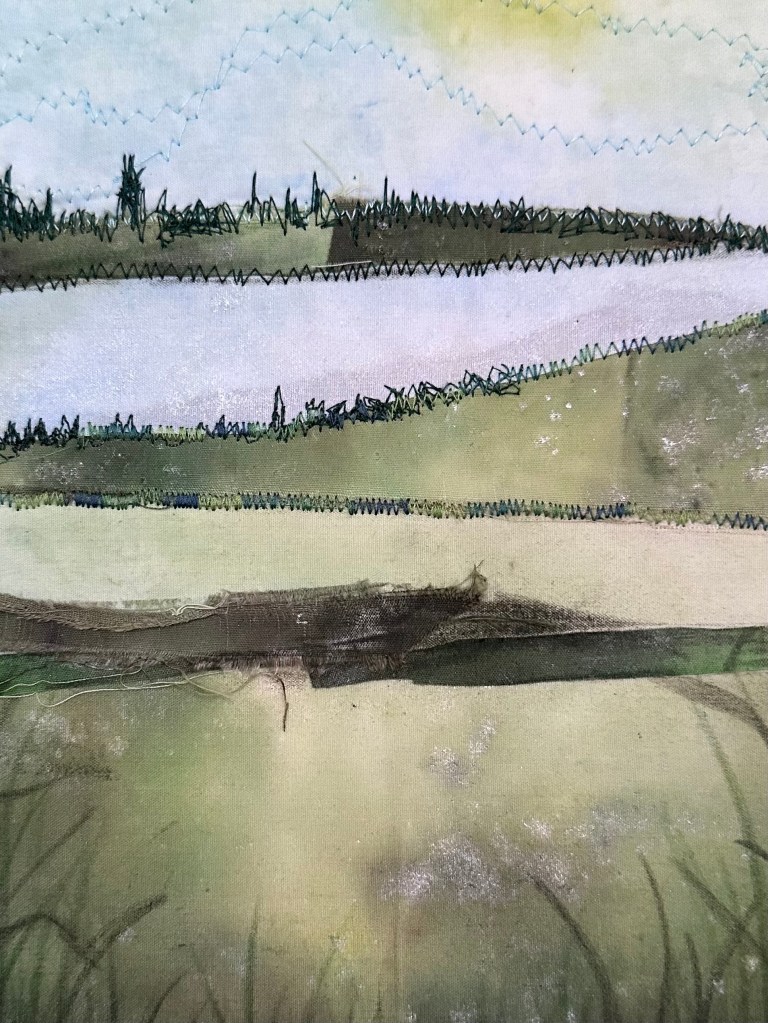 Once I was happy with the composition I ironed everything to stick it down. I was too far gone enjoying myself to pay much attention to the composition really and actually made a hug mistake by breaking the sky with a line of hills. However, I went with it telling myself it was a bank of cloud hugging the hills.