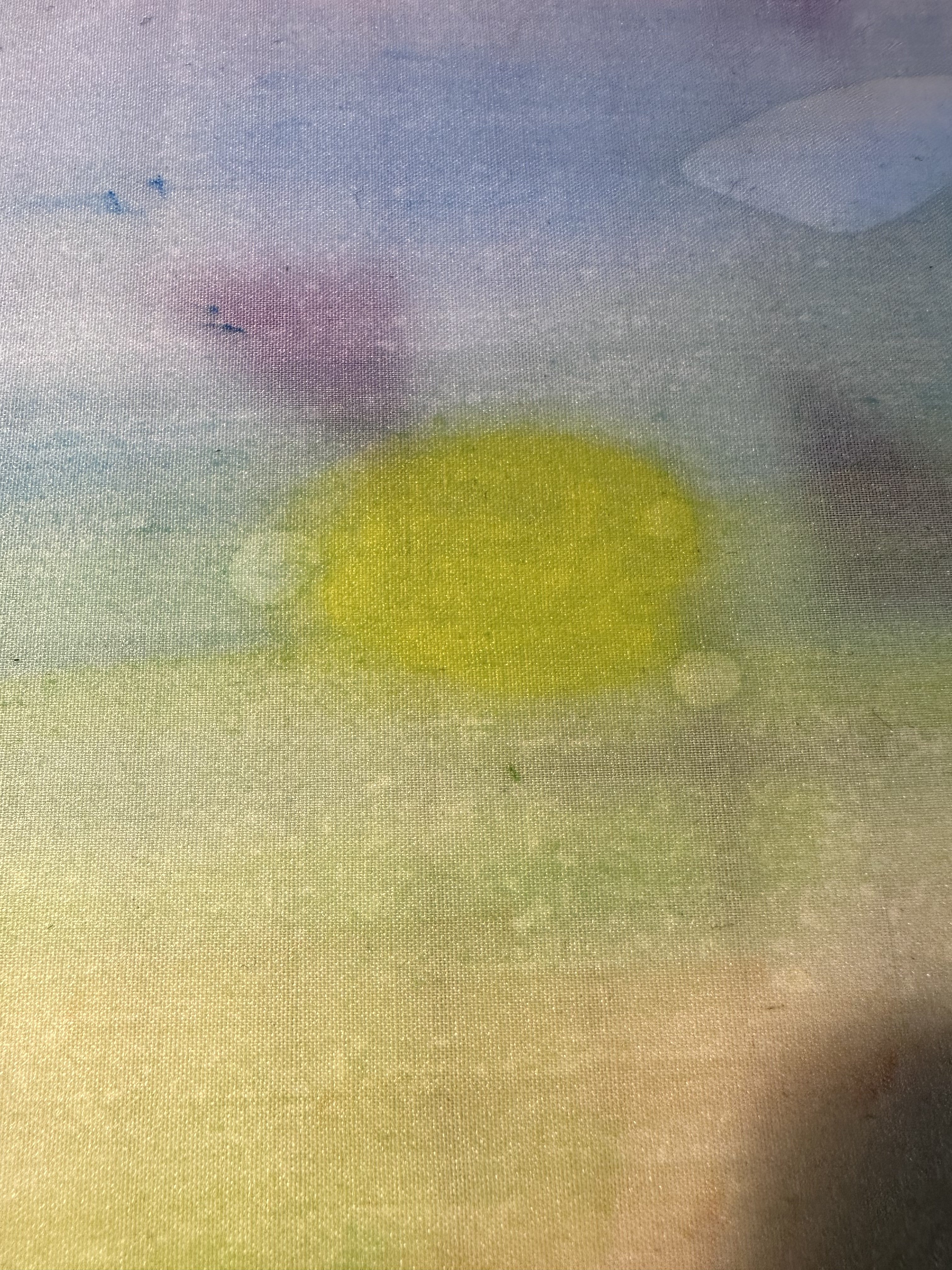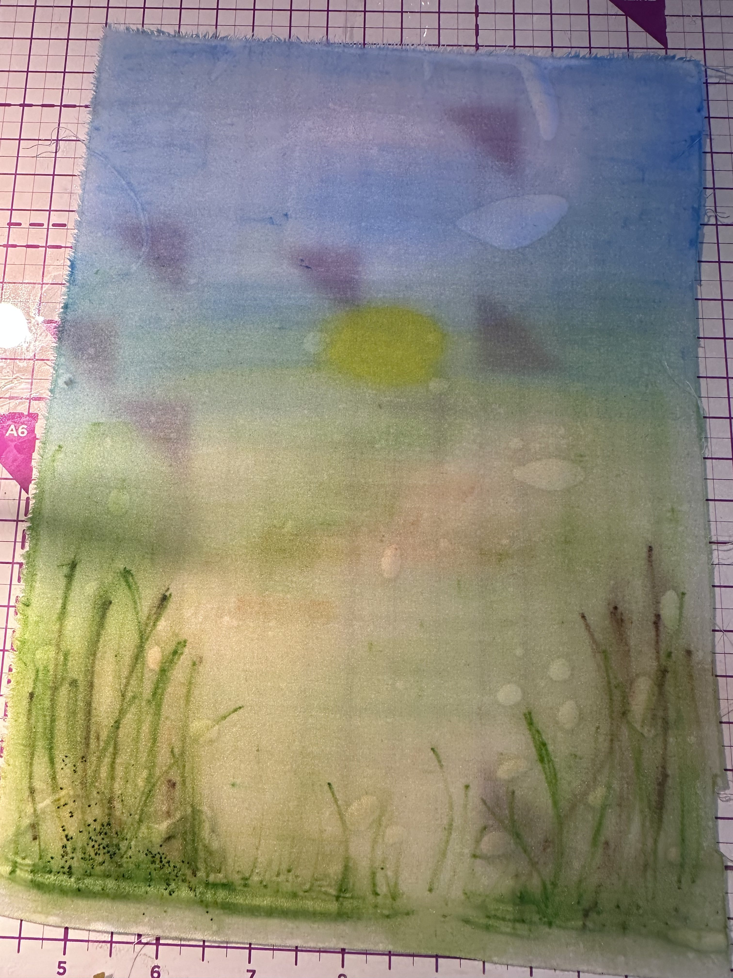 Let’s start at the beginning. I two Pieces of white fabric and sprayed one of them thoroughly with water until it was completely wet. Then using my Inktense pencils from Derwent I added colour to the fabric . I loosely added colours to represent sky, sun, and greenery. This was only to be the background so I wanted it very lose and watery