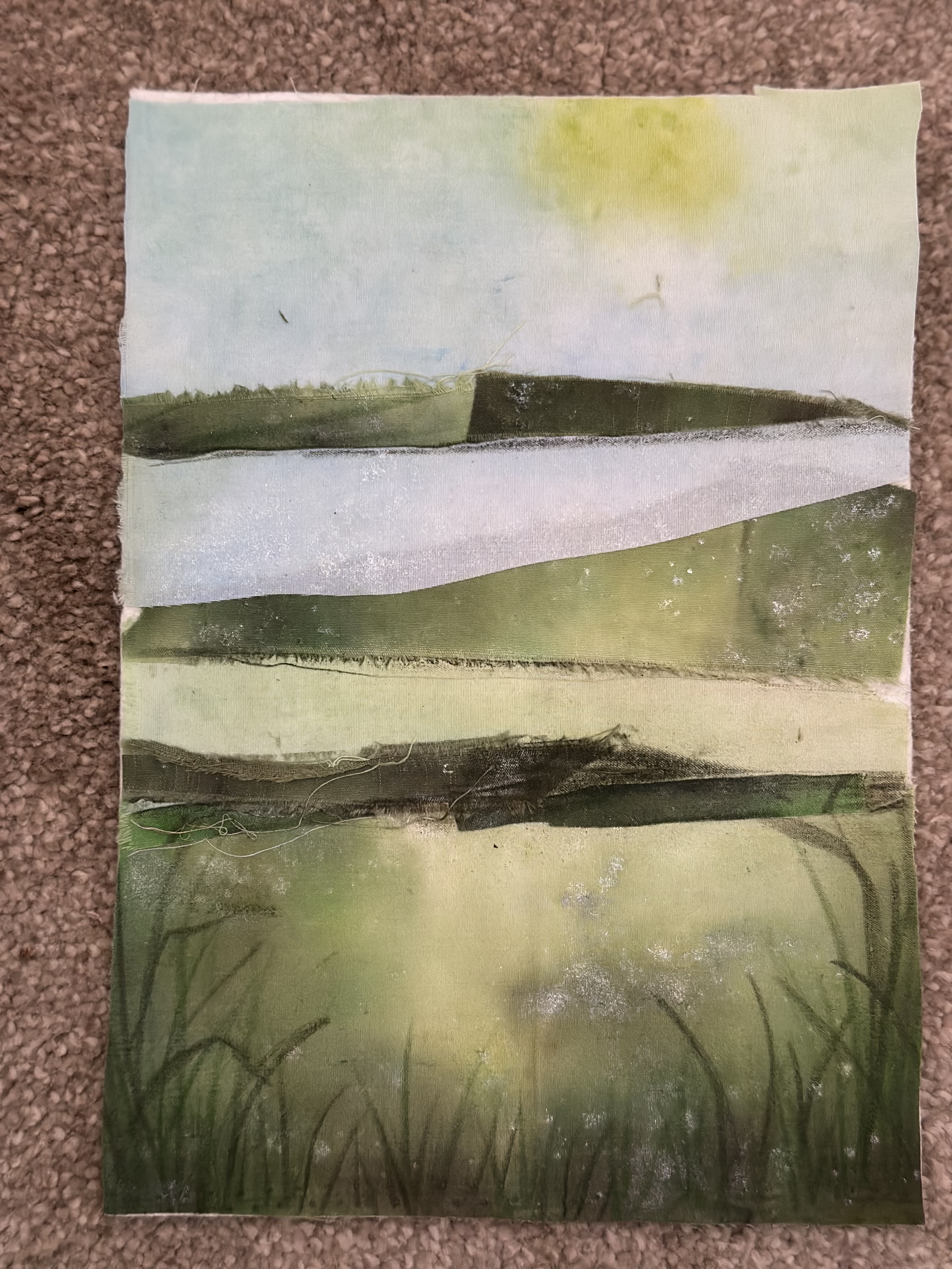 Once I was happy with the composition I ironed everything to stick it down. I was too far gone enjoying myself to pay much attention to the composition really and actually made a hug mistake by breaking the sky with a line of hills. However, I went with it telling myself it was a bank of cloud hugging the hills.