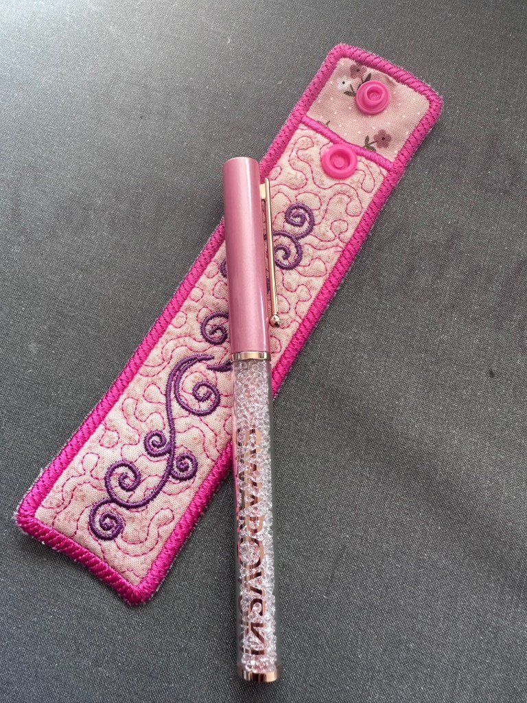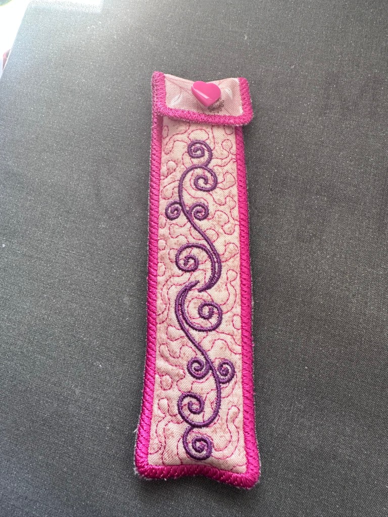 A pen /nail file holder, I chose to stitch it with the flap closing but you get two designs, the other is open topped.