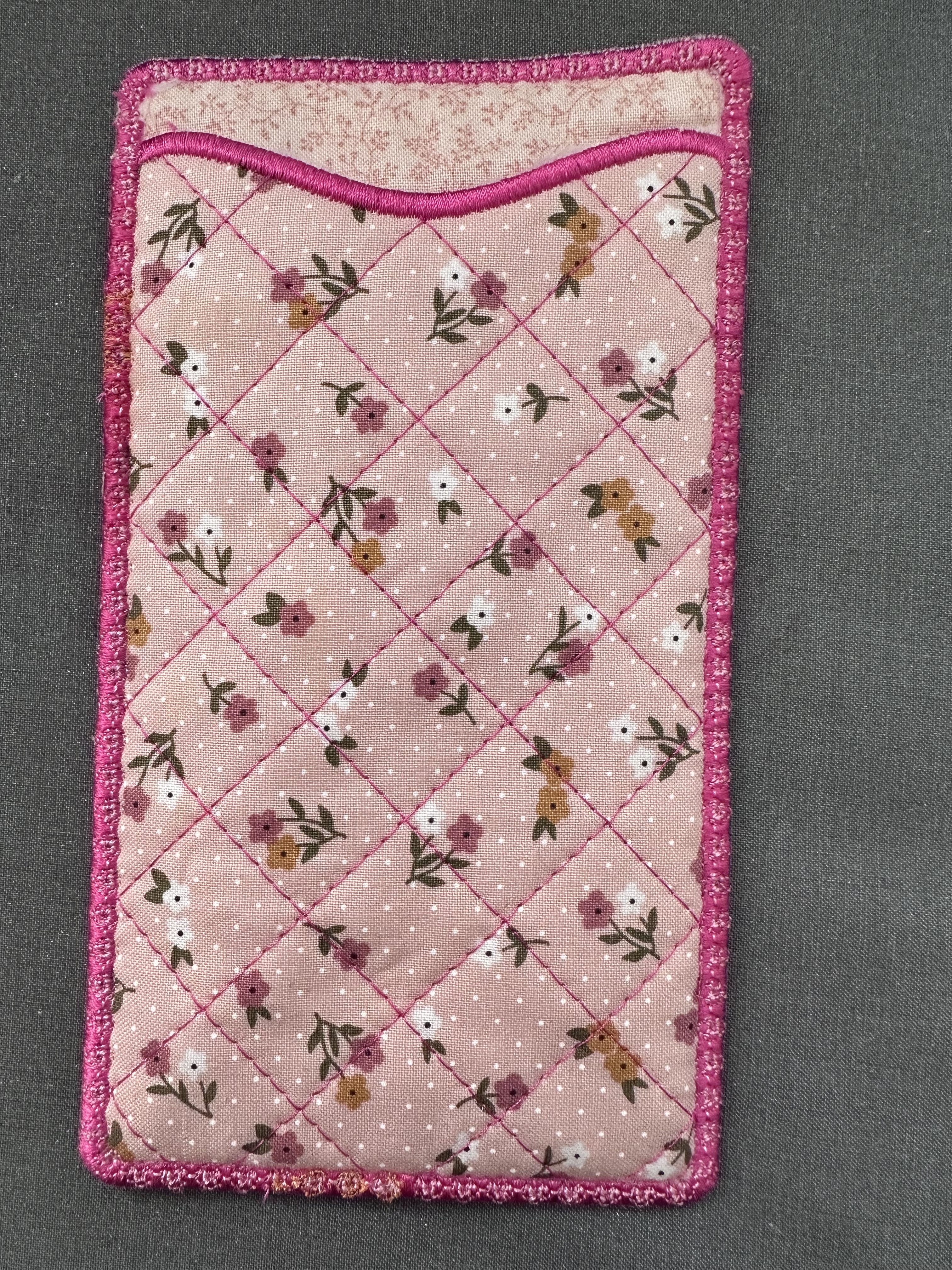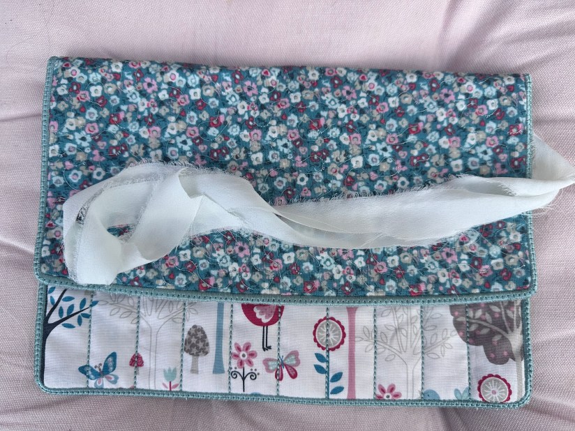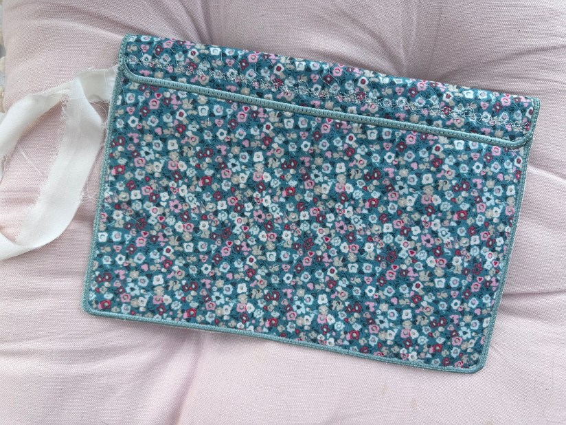 So it takes two hooping but brings the two together seamlessly, it has beautiful edging combining satin stitch with a running stitch to give an unusual finish. Two of the features I particularly like are the beautiful flower design which runs in two lines forming a pretty border, and the gorgeous quilting on the flap.